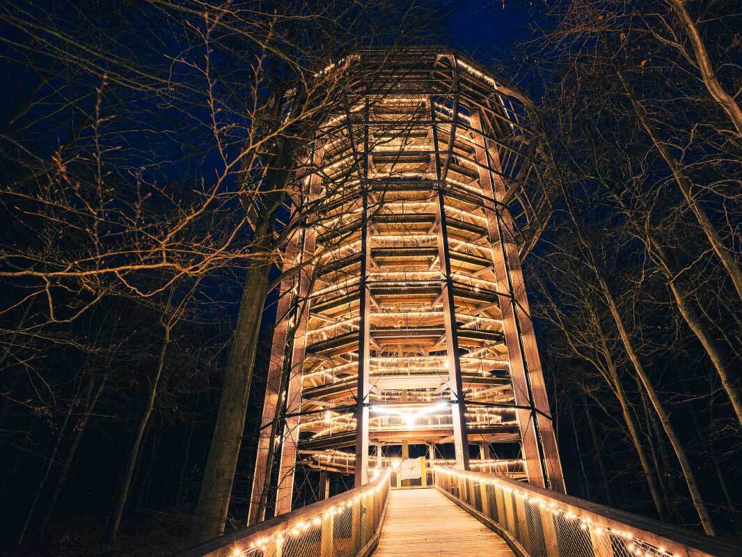 Der gesamte Baumwipfelpfad im Naturerbe Zentrum Rügen erstrahlt auch in diesem Winter in einem sanften, warmen Licht. Kilometerlange Lichterketten umhüllen den Pfad und den Aussichtsturm „Adlerhorst“ und lassen ihn wie ein leuchtendes Wahrzeichen in der Dunkelheit erscheinen.