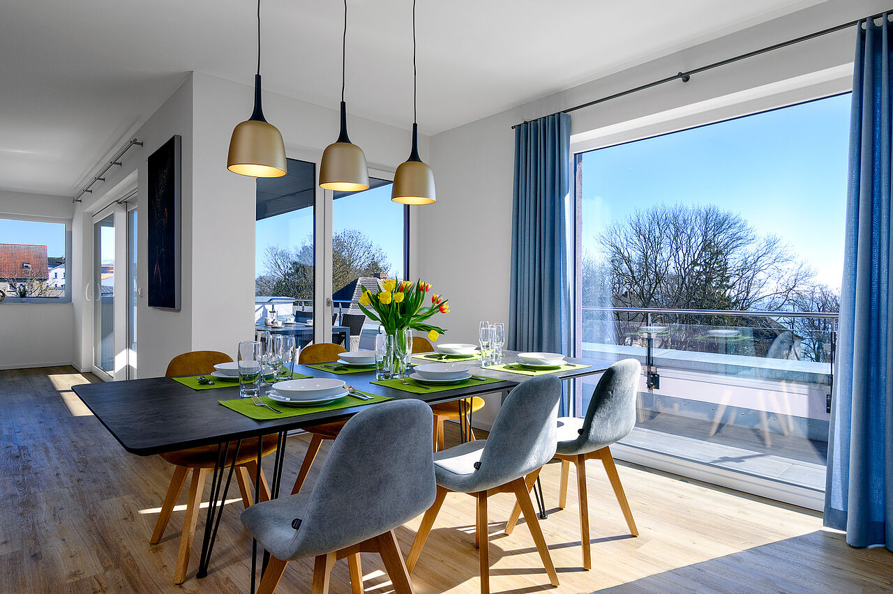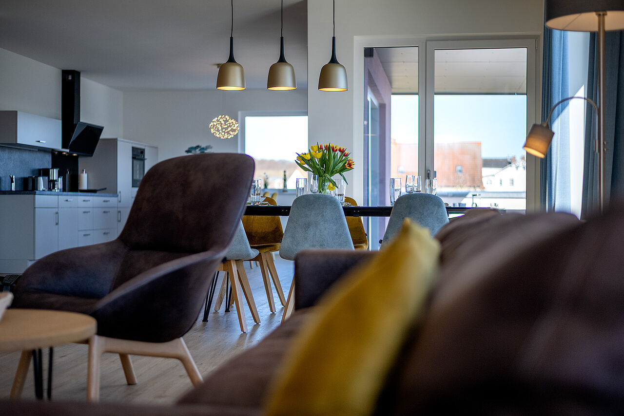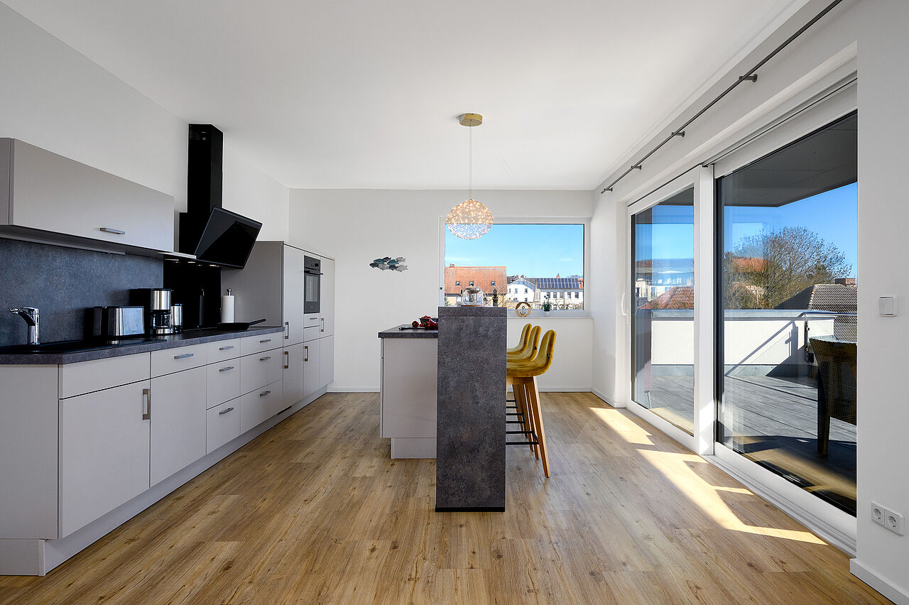 Die Küche verfügt über alles was Sie benötigen wie Backofen, Kühlschrank mit Eisfach, usw. Bettwäsche & Handtücher sowie Geschirrtücher sind bei Ihrer Anreise vorhanden. Darüber hinaus gibt es einen Wohnraum mit großer Küche, Loungebereich und Esstisch und eine Süd-DachTerrasse mit Panorama Ostseeblick.