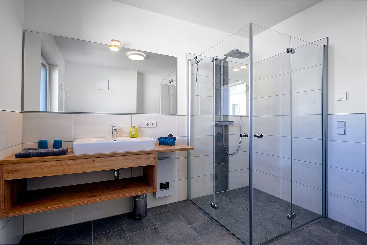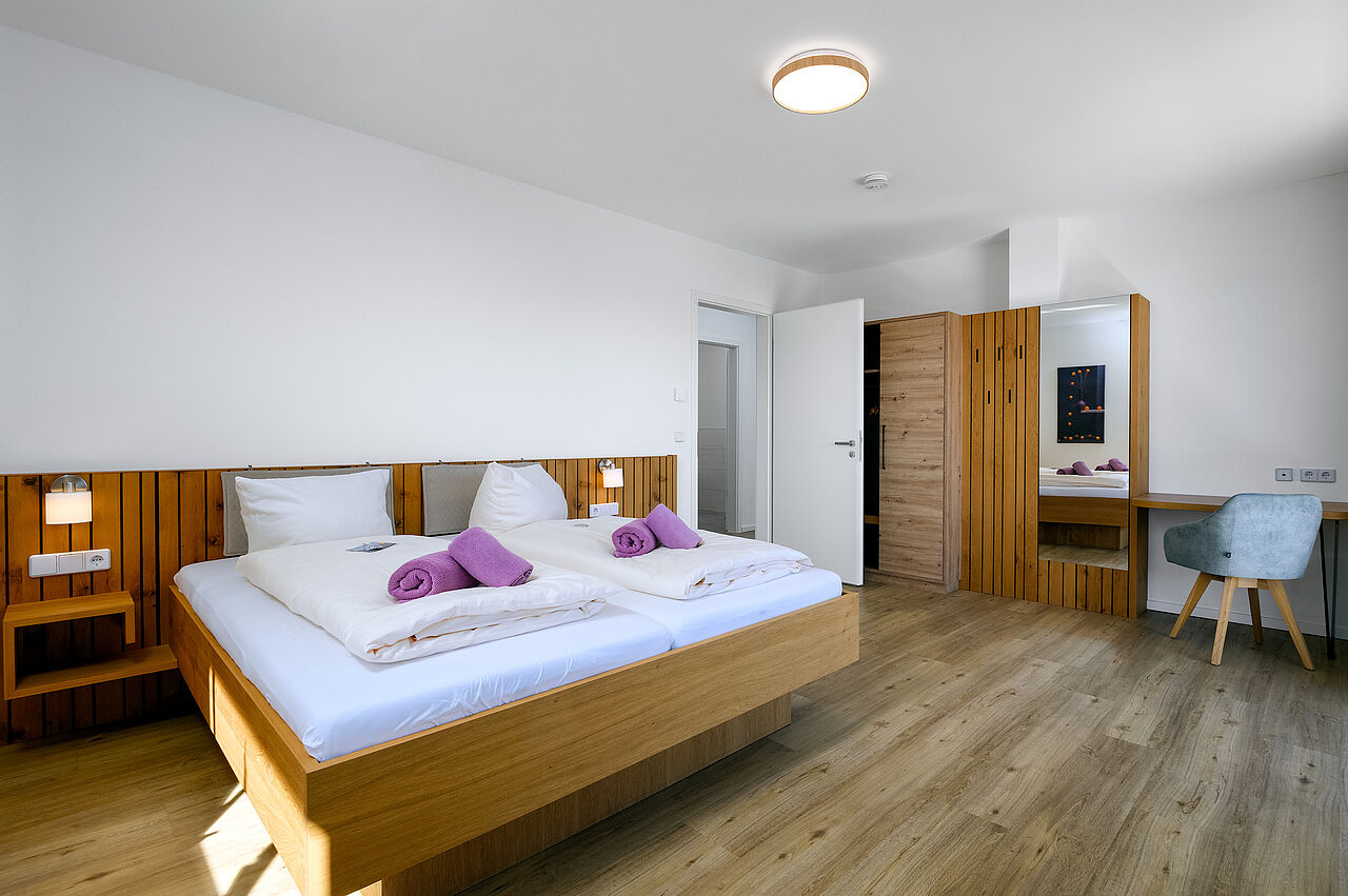 Die Wohnung verfügt über drei Schlafzimmer, jeweils mit Doppelbett (200 × 180) sowie zwei Bäder. Beide Badezimmer verfügen über Dusche & WC, Fön, usw. Ein Badezimmer ist zusätzlich mit einer Badewanne ausgestattet. Gerne stellen wir Ihnen 1-2 Kinderbetten sowie Hochstuhl zur Verfügung.
