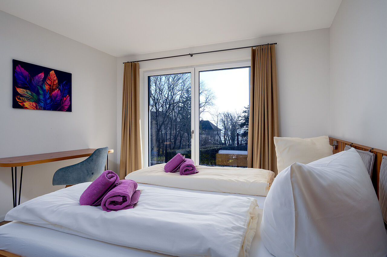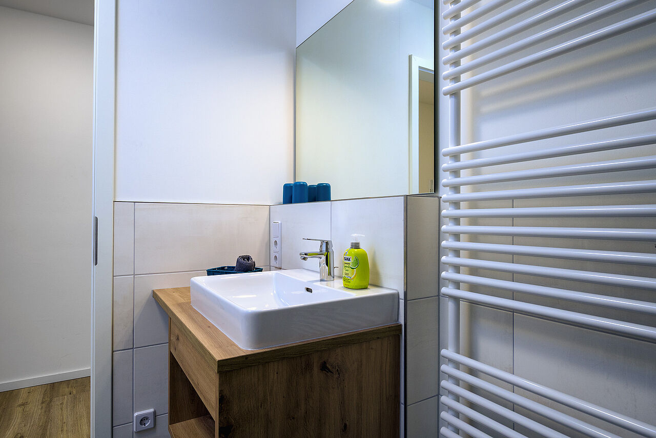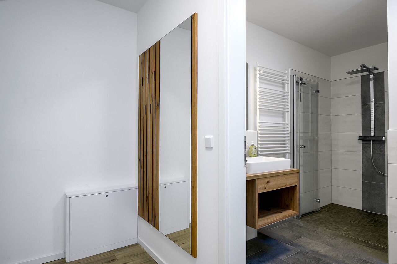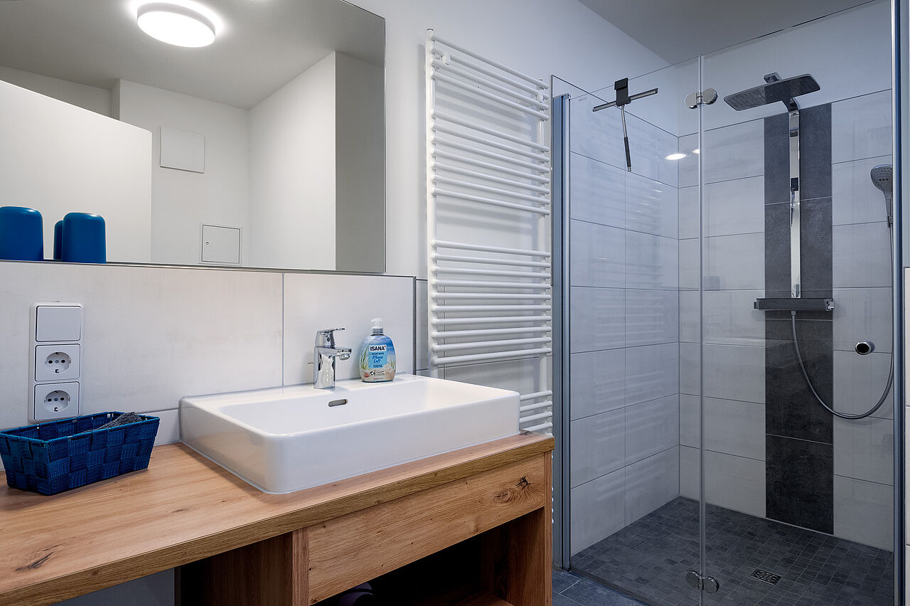 Neuwertige & hochwertig ausgestattete Ferienwohnung mit absoluter Wohlfühl-Atmosphäre. Die Wohnung verfügt über ein Schlafzimmer mit Doppelbett (200 × 180) sowie ein Badezimmer mit Dusche & WC, Fön.