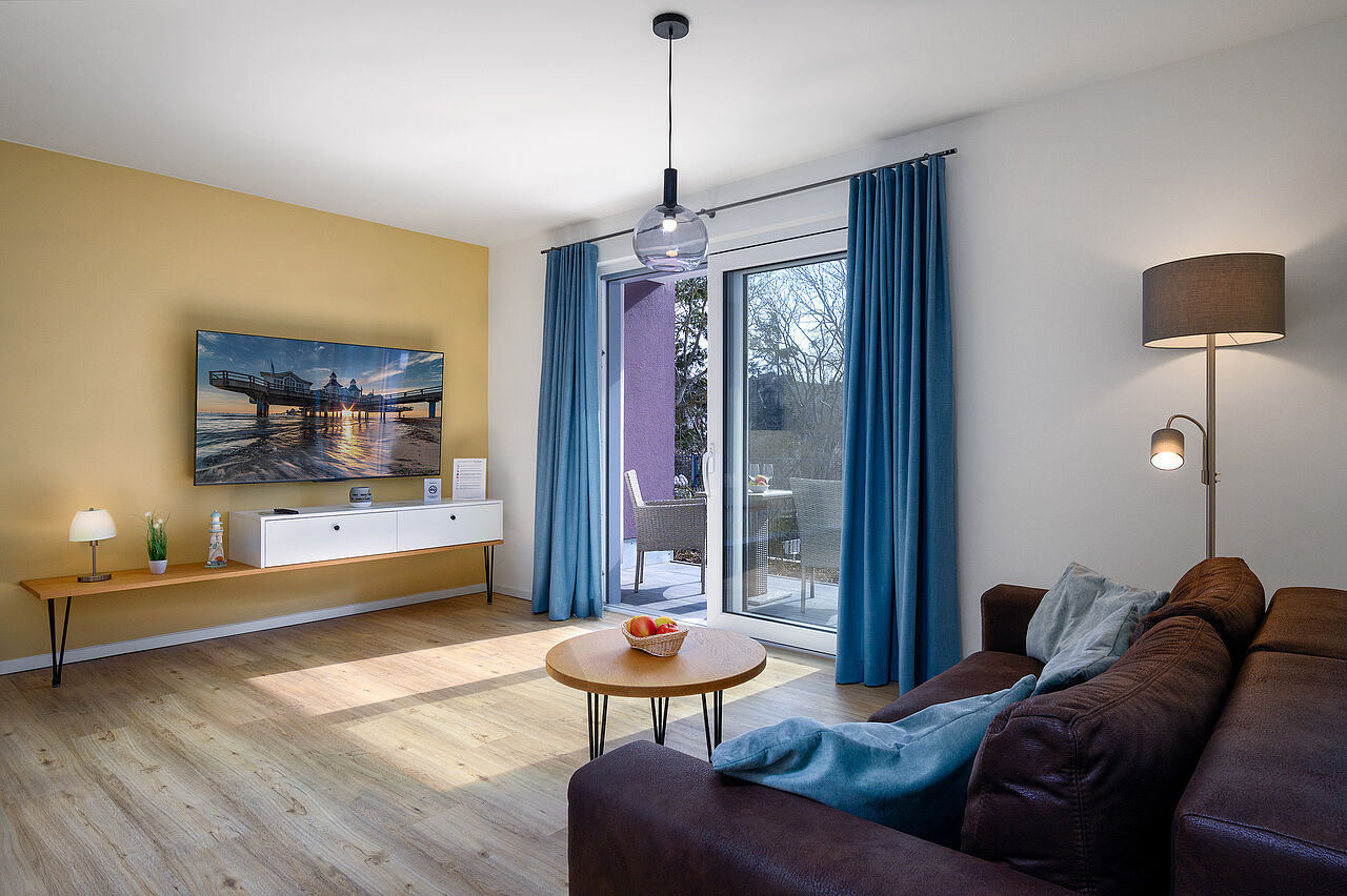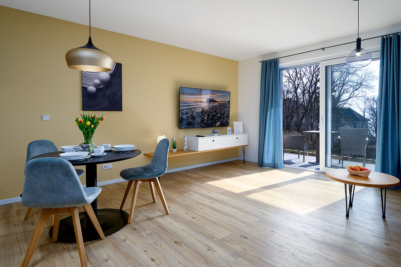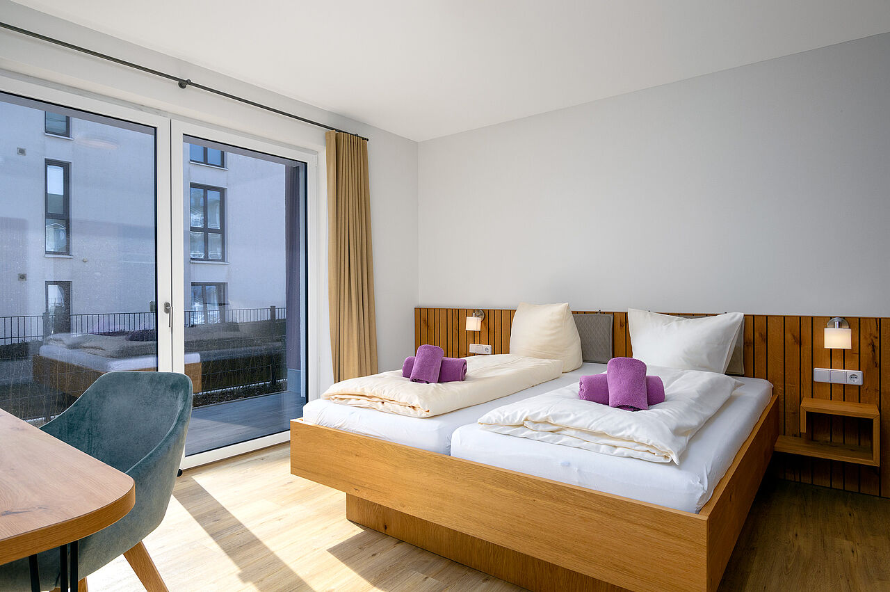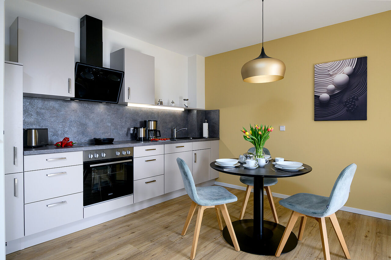 Die Küche ist voll ausgestattete mit Backofen, Kühlschrank mit Eisfach, usw. Bettwäsche & Handtücher sowie Geschirrtücher sind bei Ihrer Anreise vorhanden. Darüber hinaus gibt es einen Wohnraum mit Küche, Loungebereich und Esstisch sowie einen Süd-Balkon bzw. Terrasse direkt vor Wohn- und Schlafzimmer.