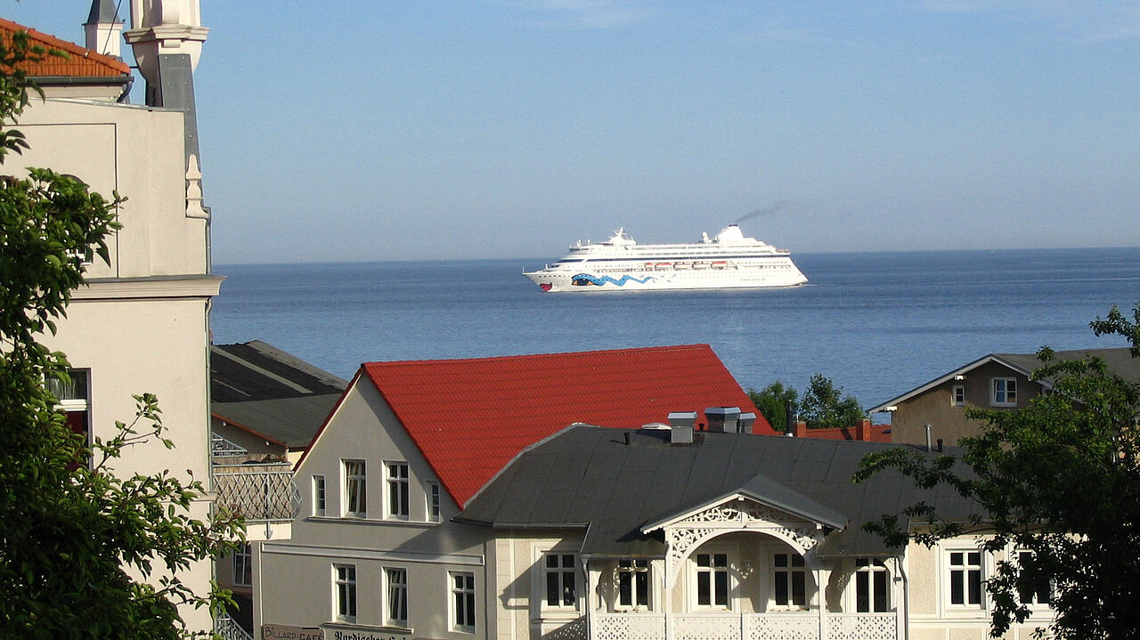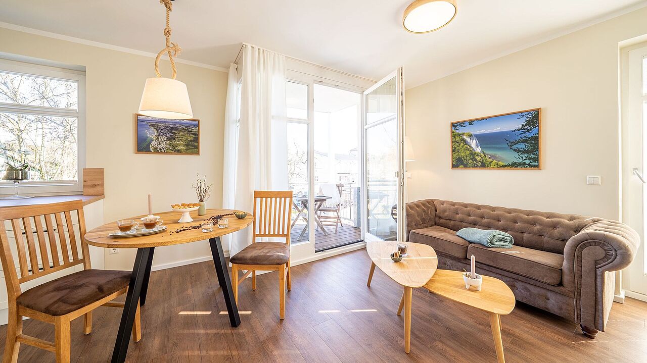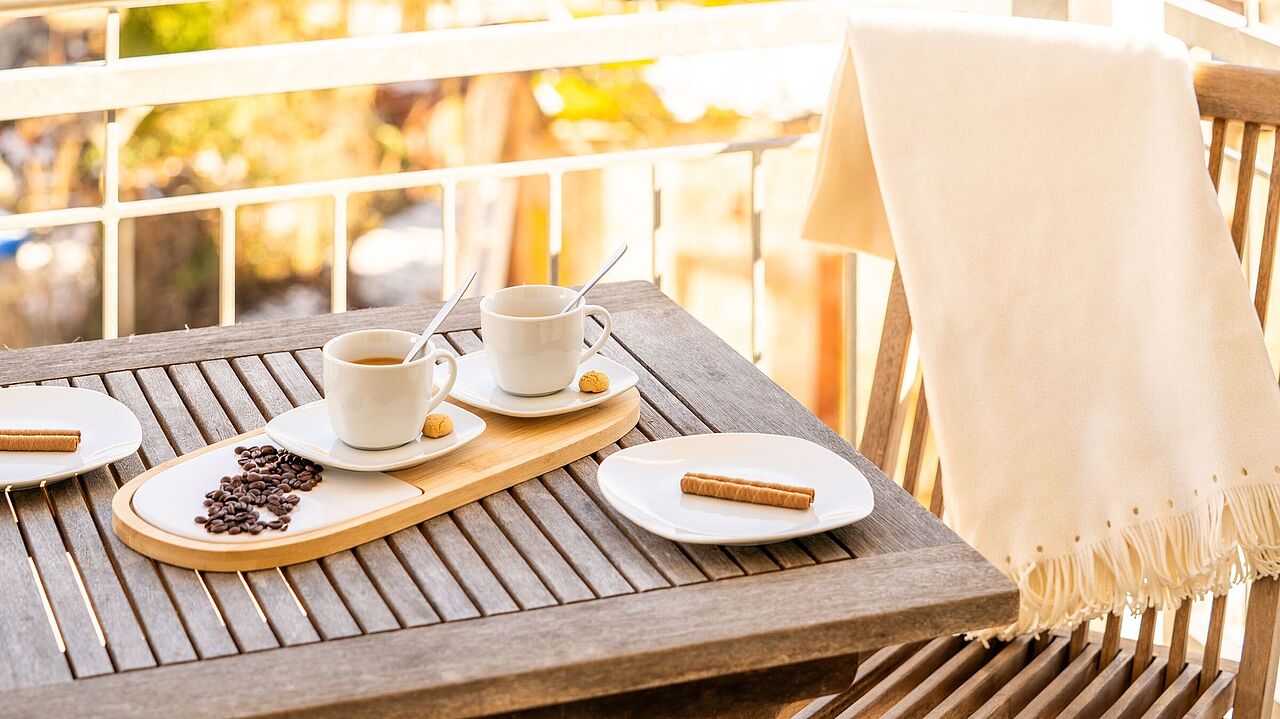- Balkon Ost mit seitlichem Blick zur Ostsee, Balkon Süd mit direktem Seeblick und Blick über den „Alten Markt“, ausgestattet mit Teakholzmöbeln