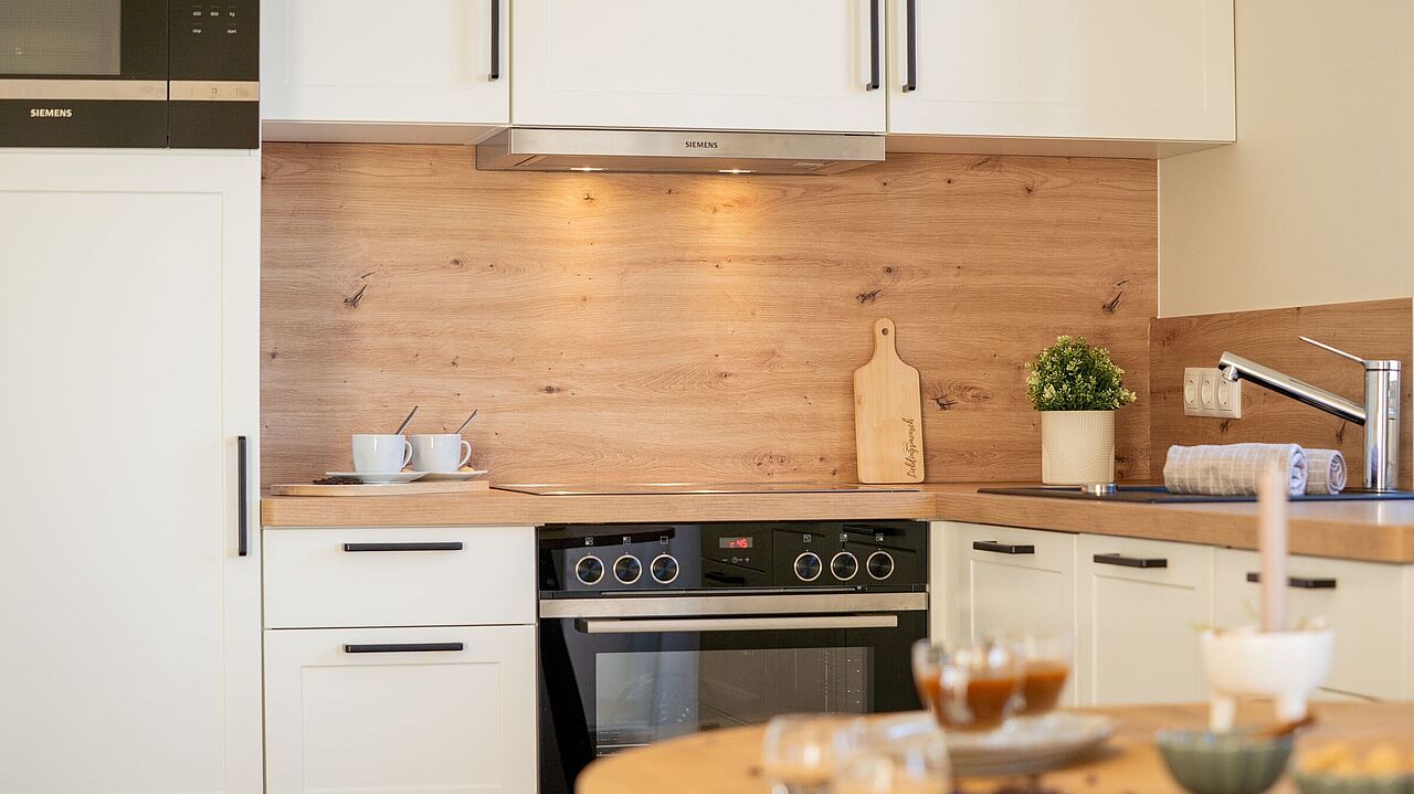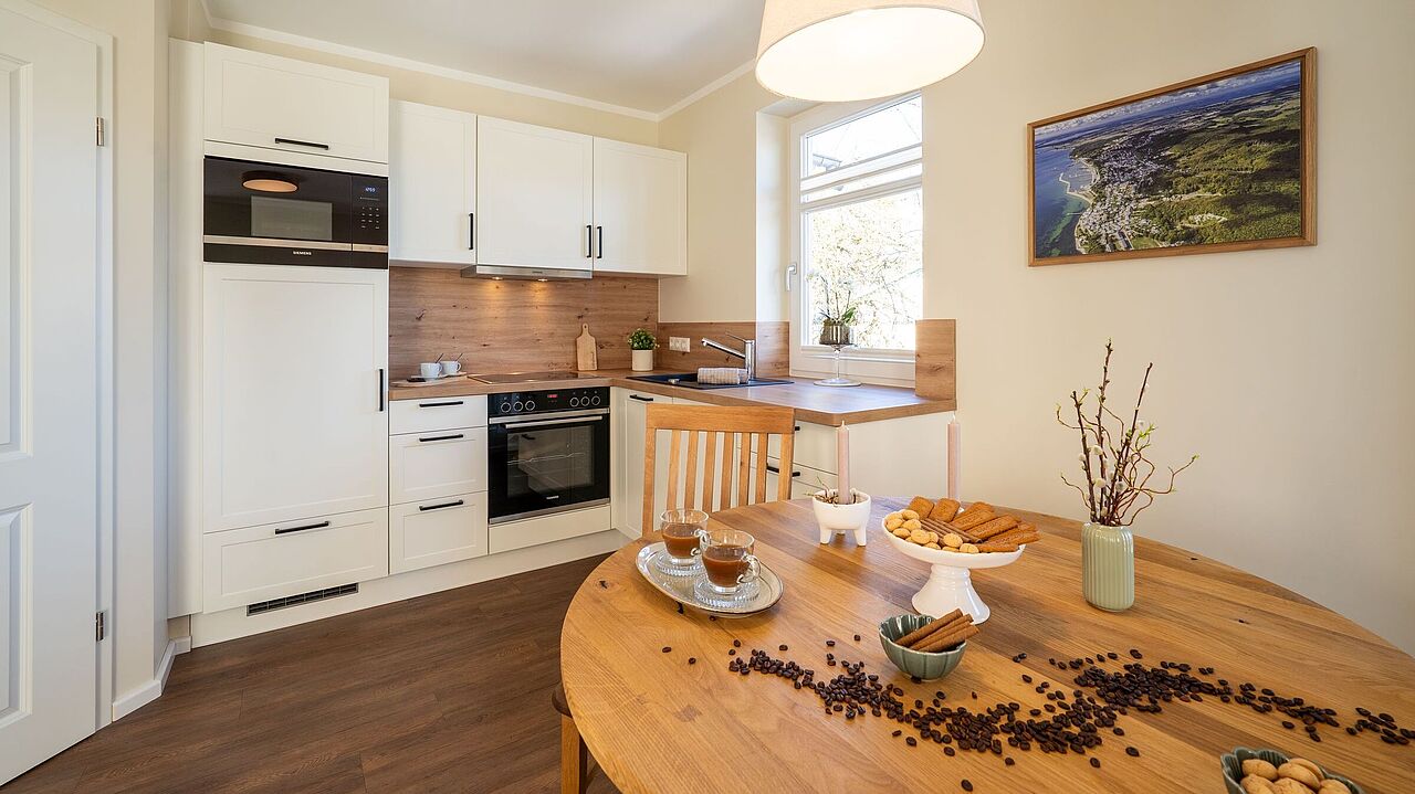 - Einbauküche mit gehobener Ausstattung sowie Ceranfeld, Backofen, Geschirrspülmaschine, Dunstabzug, Mikrowelle, Kühlschrank, Mixer