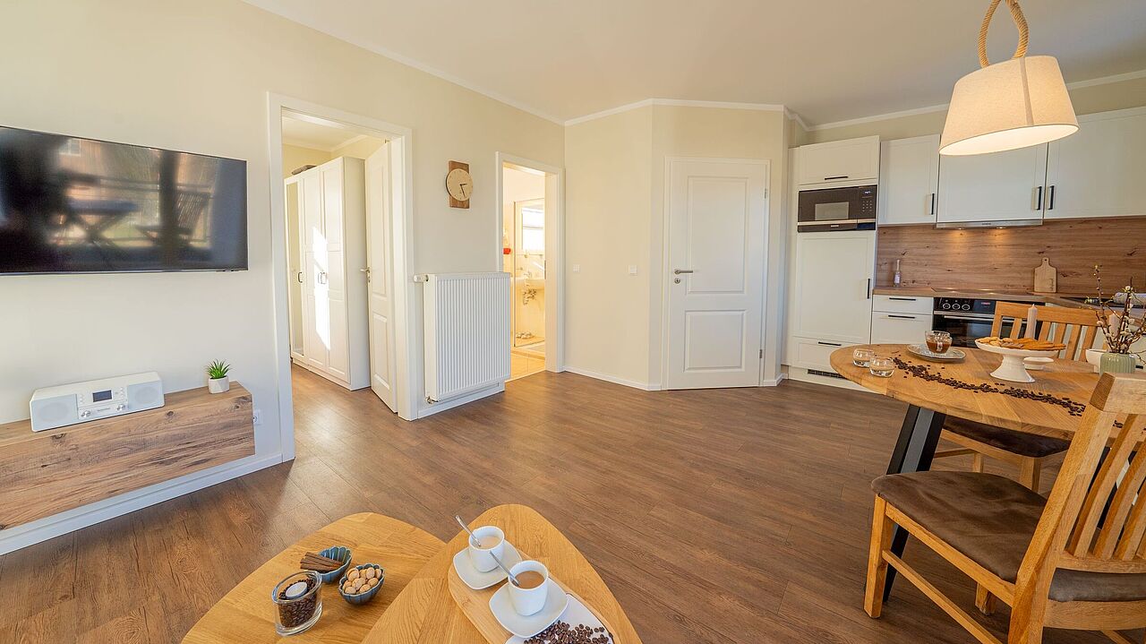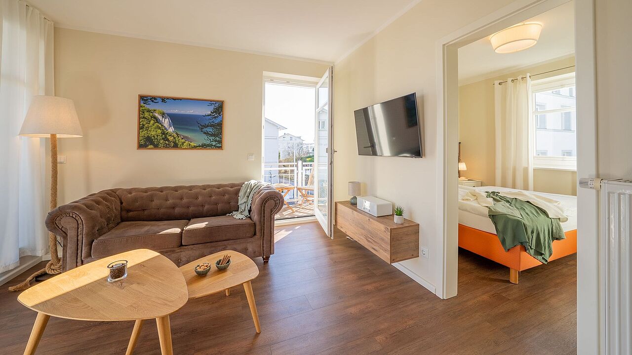 2-Raum-Ferienwohnung im 1. Obergeschoss, mit eigenem Aufgang, Wohnraum mit integrierter Einbauküche, Schlafzimmer, Bad, 2 Balkone, mit Ostseeblick, Internetzugang