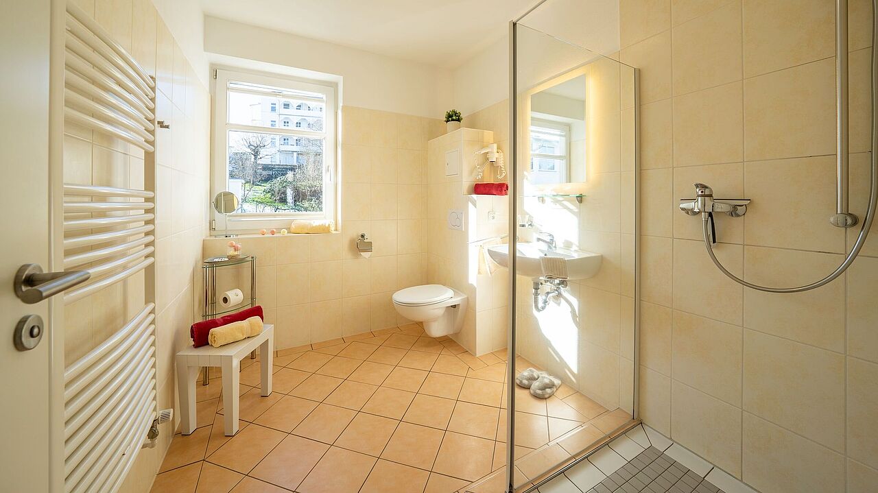- Großzügiges Badezimmer mit ebenerdiger Dusche, WC, Haartrockner, Kosmetikspiegel, Handtuchheizung, Fußbodenheizung